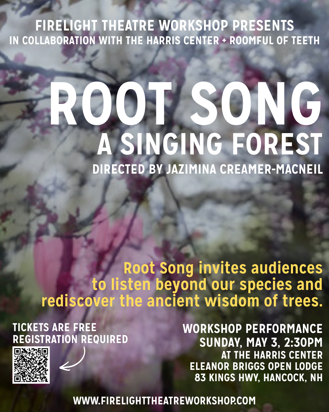 In collaboration with Firelight Theatre Workshop, Root Song will be brought from page to stage over four days at the Harris Center in early May. We invite you to join in the creation of this important work by being Root Song’s very first audience during a preview performance on May 3rd, 2026 at 2:30pm.