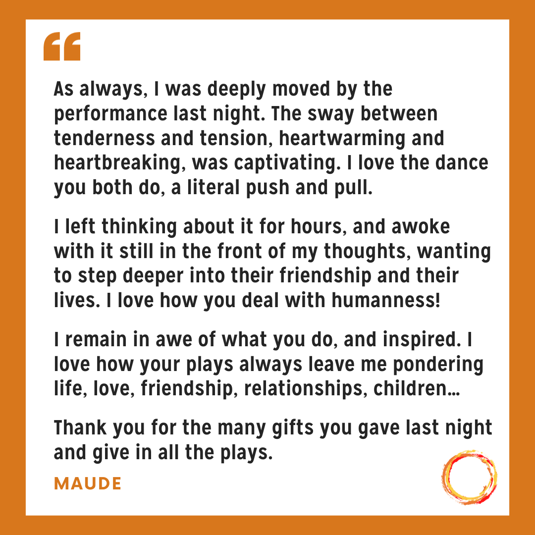 The 12-part live series was written + performed over six years (2018-2024) in non-traditional, site-specific environments. Audiences have peeked in on Margaret and Ralph’s encounters at their birthday picnic, when they're hard at work, on a late night phone call, searching for a lost metal treasure in a pile of snow, during a power outage, in a waiting room after Margaret’s untimely death. They’ve even wrestled each other late at night in Ralph’s garage. During the pandemic, Firelight continued to share the story of Margaret and Ralph using storytelling modes that didn’t require live gathering: by car radio, snail mail, and video.